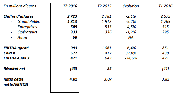 La dette nette de SFR Group s’élève à 15,121 milliards d’euros à la fin du T2 2016, soit une augmentation de 673 millions d’euros par rapport au T1 2016 reflétant l’acquisition de la participation dans NextRadioTV et Altice Media Group France, ainsi que les coûts exceptionnels de l’opération de refinancement du mois d’avril. Le ratio de dette nette / EBITDA retraité s’élève à 4.0x fin juin 2016.