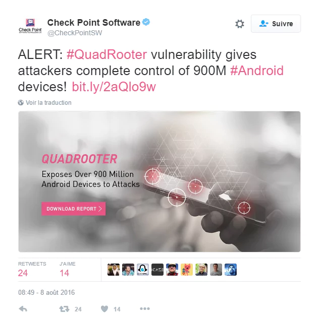 Selon l’entreprise de sécurité informatique israélienne Check Point, 4 failles sécuritaires, qu’ils appellent "QuadRooter", ont été trouvés. Celles-ci permettraient à des pirates de contrôler les appareils Android à distance pour récolter les données personnelles des utilisateurs.