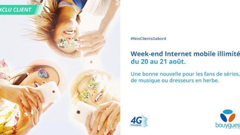 Après avoir proposé les week end de surf illimité durant les 6 premiers mois de l’année, Bouygues Télécom ouvre à nouveau les vannes de son réseau mobile pour offrir un week-end de data en 4G. Cela concerne tous les clients mobiles de Bouygues Télécom, le 20 et le 21 aout