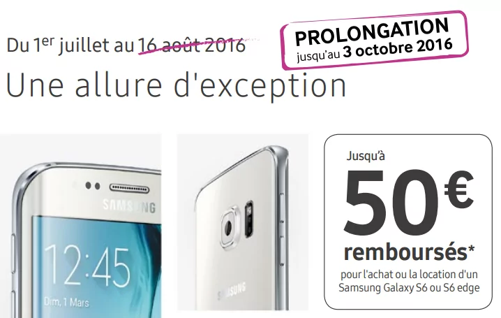 Depuis le 1er juillet, dans la boutique Free Mobile, une offre de remboursement de 50€ est proposée sur les Galaxy S6 et S6 Edge. Initialement prévue jusqu’à aujourd’hui, le 16 août, cette offre vient d’être prolongée jusqu’au 3 octobre. Elle est valable sur ces deux smartphones aussi bien à la vente qu’avec l’offre de location de Free Mobile.