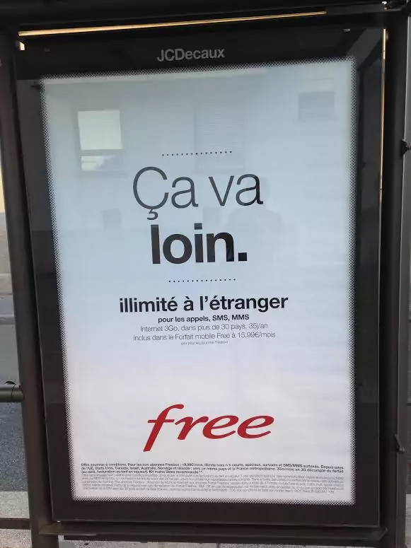 Nous vous informions hier que Free Mobile avait lancé une nouvelle campagne de publicités sur le mobilier urbain. Et cette campagne est composée de plusieurs affiches. Après la mise en avant de la 4G, c’est l’illimité à l’étranger (appels, SMS, MMS et 3Go de data, en Europe, Etats-Unis, Canada, Australie et Israël) qui est le sujet de cette deuxième affiche qui nous a été envoyée par McArthur, un lecteur d’Univers Freebox.