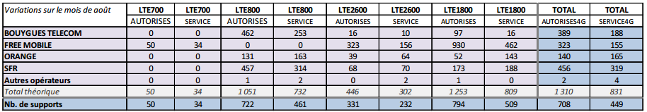 Le bilan des sites 4G mis en service en métropole s’établit comme suit par l’ANFR :