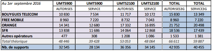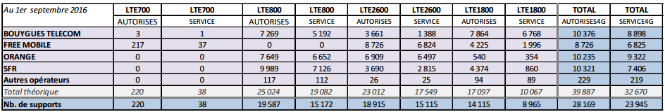 L’ANFR vient de publier les chiffres de déploiement des réseaux mobiles au 1er septembre 2016. A cette date, 28 169 sites sont autorisés, dont 23 945 en service, pour la 4G tous opérateurs confondus.