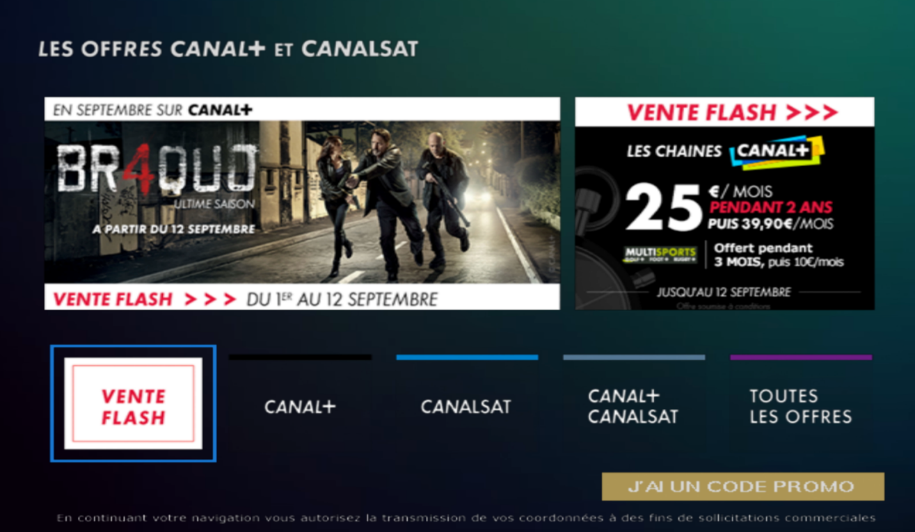 Toutes les chaînes Canal+ étaient offertes sur la Freebox du jeudi 29 août au dimanche 2 septembre. Depuis lundi, Canal+ affiche une bande annonce annonçant une vente flash « réservée au abonnés Free » est valable jusqu’au 12 septembre. L’inscription se fait directement depuis le canal 4 de la Freebox.