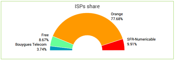 On constate qu’Orange a une position clairement dominante sur le marché FTTH avec plus de 77 % des tests effectués par ses clients (contre 81% le trimestre précédent). Viennent ensuite, très loin derrière, SFR avec 9,91% et Free 8,67% chacun, en hausse tous les deux. Et enfin Bouygues Télécom avec seulement 3,74 % des tests effectués. Cela parait logique puisque c’est l’opérateur le moins développé dans le FTTH avec seulement 70 000 abonnés. (voir le classement du nombre d’abonnés FTTH chez chaque opérateur)