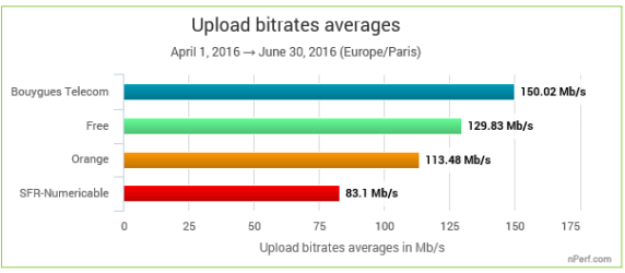 Bouygues Telecom a fourni le meilleur débit montant FTTH au deuxième trimestre 2016. Free, en 2ème position.
