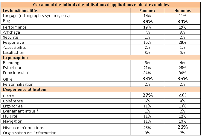 Ainsi, les femmes sont plus sensibles aux bugs (39% contre 34% des hommes) et à la performance (19%) quand les hommes sont plus exigeants quant au caractère "responsive" d’un site (20%).Pour ce qui est de la perception, 38% des femmes sont plus attentives à l’offre contre 35% des hommes. Concernant l’expérience utilisateur, 27% des femmes ont besoin de clarté quand 26% des hommes privilégient le niveau d’informations.