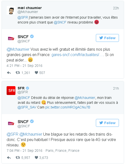 Clin d’œil – Si les community managers sont présents sur Twitter avant tout pour aider les clients, il arrive régulièrement que ceux-ci fassent un peu d’humour ou se taclent gentiment. C’est le cas cette fois entre le CM de la SFR et celui de SNCF. Le premier a lancé le sujet sur les trains en retard, le deuxième a répliqué en pointant la difficulté à capter la 4G de SFR.