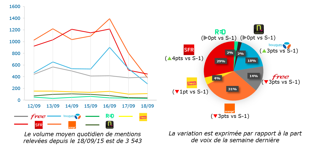 Webhelp vient de publier son " baromètre des télécoms" hebdomadaire pour la semaine du 12 au 18 septembre 2016, qui collecte les données automatiquement sur un corpus de plus de 600 000 000 sites, blogs, forums, profils Facebook et Twitter.