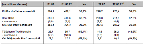 Le nombre total d’abonnés Onetel a décliné au cours du 1er semestre pour atteindre 194 000 abonnés au 30 Juin 2007 contre 220 000 abonnés au 31 Décembre 2006. Le revenu moyen par abonné s’est élevé à 9,9 euros au 1er semestre 2007. De plus, le chiffre d’affaires de Kedra a décliné de plus 77% en raison de l’interconnexion directe avec les opérateurs mobiles de plus en plus importante. La société Kertel, l’activité de cartes téléphoniques prépayées du Groupe, a été cédée le 7 Février 2007.