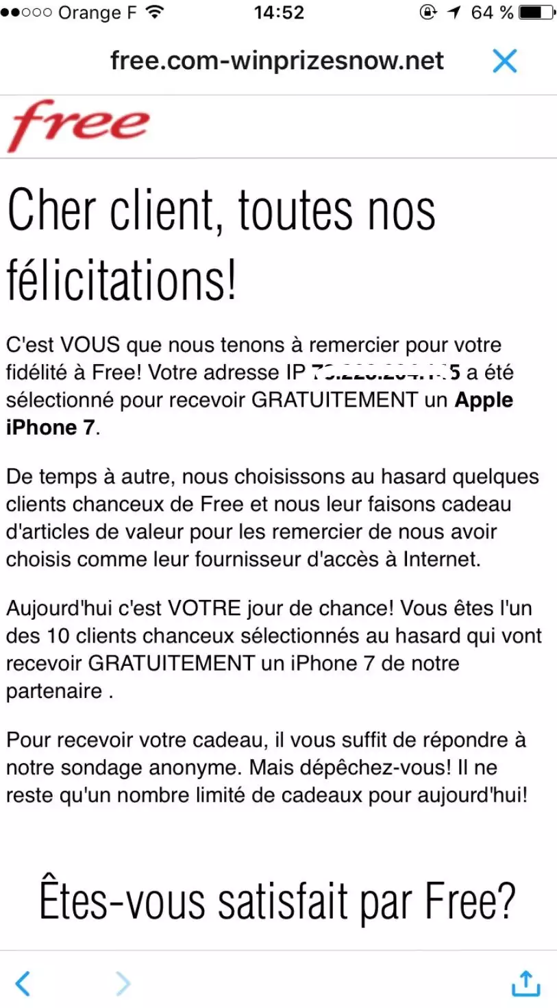 A peine sorti, le nouvel iPhone 7 est déjà intégré dans un nouveau filoutage destiné à tromper les abonnés Free mobile. Plusieurs témoignages sur Twitter remontent un pseudo message de Free qui annonce qu’il tire au sort, chaque jour, 10 clients pour leur offrir un iPhone 7. Et bien sûr le destinataire a été sélectionné. Pour bénéficier de ce faux cadeau, l’abonné est invité à cliquer sur un lien pour répondre à un questionnaire.