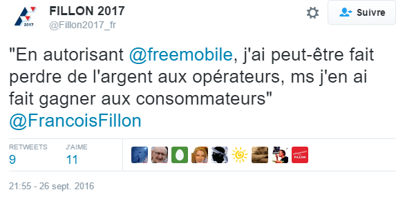 Et cette histoire refait surface à l’occasion des primaires de la droite du centre. François Fillon vient en effet de se féliciter d’avoir permis l’arrivée de Free et d’avoir fait gagner de l’argent aux consommateurs dans un message qu’il a tweeté hier soir.