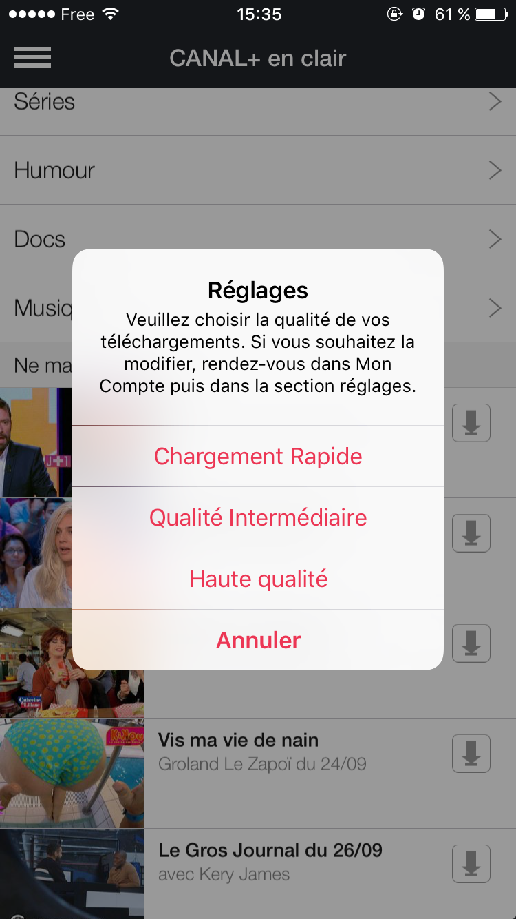 Dans cette rubrique, il est possible de télécharger les programmes pour en profiter hors connexion. Vous avez la possibilité de choisir entre trois qualités : Chargement rapide, Qualité intermédiaire et Haute qualité, soit respectivement du 360p, du 480p et du 720p. Chaque vidéo téléchargée est visible pendant 48h.