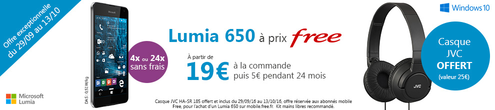 Lumia 650 : Pour l’achat de Lumia 650 jusqu’au 13 octobre, le Casque JVC (HA-SR 185 Noir), d’une valeur de 25€, est offert et inclus à la livraison