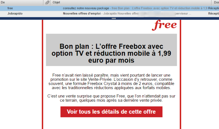 Un nouveau type de phishing vise actuellement les internautes en usurpant l’identité de Free. Cette fois-ci, ce mail ne s’adresse pas aux Freenautes, mais justement à ceux qui ne sont pas encore abonnés à la Freebox. Le pirate annonce ainsi qu’une nouvelle Vente Privée proposerait le forfait Freebox à 1,99€ par mois.