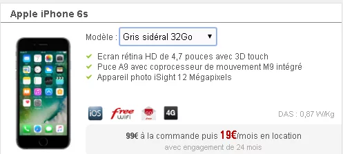 Free vient d’ajouter un nouveau modèle d’iPhone 6S dans son offre de location. Il s’agi de l’iPhone 6S en 32Go, qui est proposé dans les différents coloris : Or, Or rose, Gris sidéral et Argent. Concernant le tarif, il vous en coûtera 99 euros à la commande puis 19€/mois, avec un engagement de 24 mois.