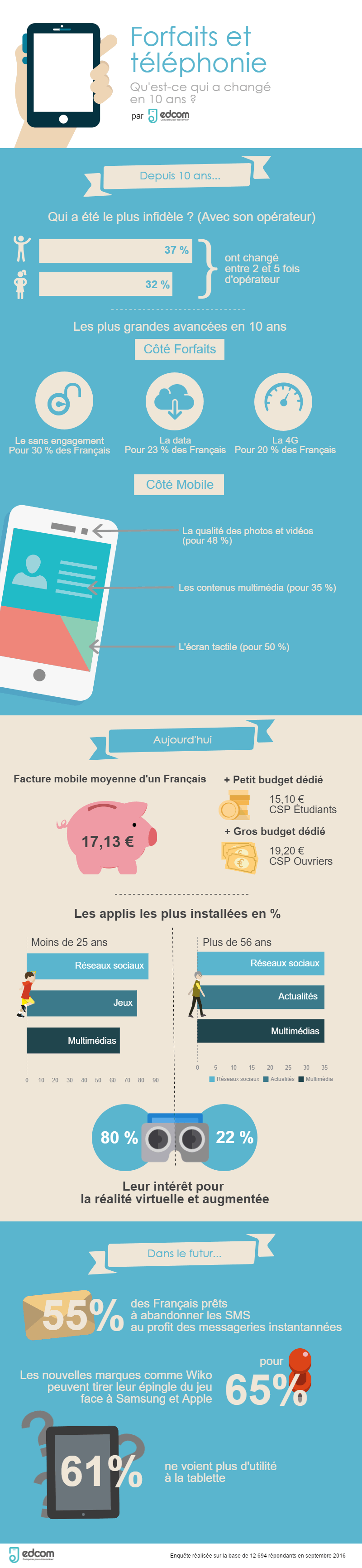 Le comparateur de forfait Edcom.fr a publié les résultats d’une enquête intitulée « Forfaits et téléphonie : ce qui a changé en 10 ans pour les Français ». Plus de 12 000 internautes ont livré leur vision de l’évolution du smartphone et des forfaits téléphoniques : type d’offres, prix, usages mobiles, applications et utilisation du SMS… Découvrez les résultats dans l’infographie ci-dessous