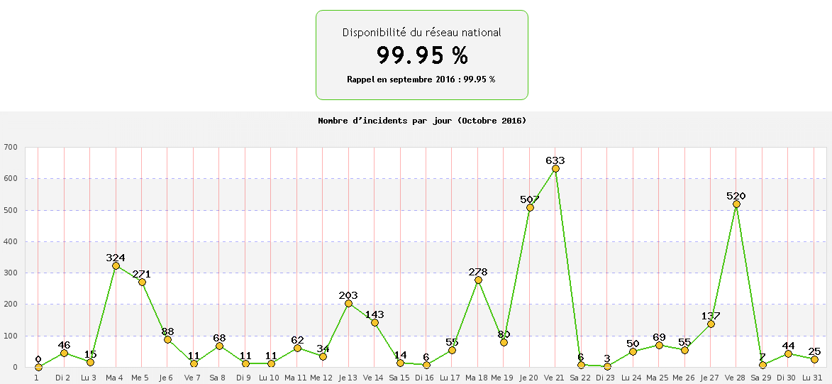 Chaque mois, free-reseau.fr, qui répertorie en temps réel les incidents sur le réseau fixe de Free, publie un rapport récapitulatif. Durant ce mois d’octobre, la disponibilité du réseau national de Free a été de 99,95%, le même chiffre que le mois précédent.