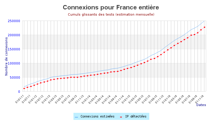 François04, qui permet d’avoir une estimation du nombre des abonnés Free grâce à la détection des IP, vient de publier le bilan des connexions pour la fibre durant le mois d’octobre 2016. Selon ces estimations, Free compte 10 083 abonnés FTTH de plus en mois, un record. Même si on est encore loin des chiffres d’Orange, Free semble donc accélérer la cadence concernant le déploiement de la fibre. Au 1er novembre, l’opérateur comptait 250 951 abonnés FTTH selon les estimations de Francois04.