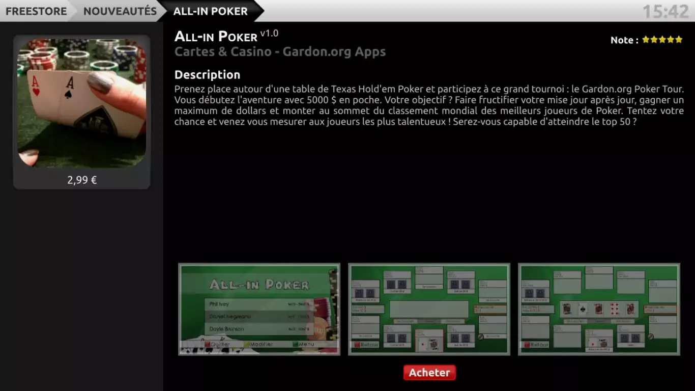 Un nouveau jeu a fait son arrivée dans le FreeStore de la Freebox Révolution. Il s’agit de All-in Poker, un jeu de poker qui se base sur les règles du Texas Hold’em. Ce jeu est disponible au prix de 2,99€ TTC.