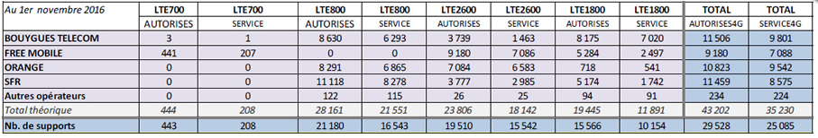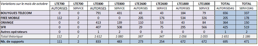 Le bilan des sites 4G mis en service en métropole s’établit comme suit par l’ANFR :