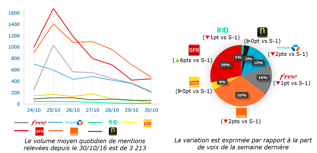 Webhelp vient de publier son " baromètre des télécoms" hebdomadaire pour la semaine du 24 au 30 octobre 2016, qui collecte les données automatiquement sur un corpus de plus de 600 000 000 sites, blogs, forums, profils Facebook et Twitter.