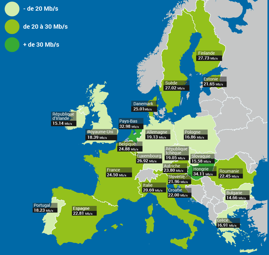 La France n’arrive qu’en huitième position avec une moyenne de 24,50 Mb/s. Néanmoins, si l’on prend en compte les cinq plus gros marchés européens en termes de population, notre pays arrive premier. Suivi par l’Espagne (22,81 Mb/s), l’Italie (20,69 Mb/s), l’Allemagne (19,13 Mb/s) et le Royaume-Uni (18,39 Mb/s).