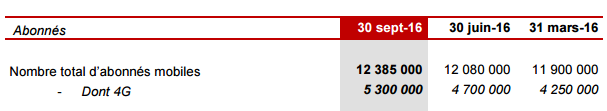 Par ailleurs, l’opérateur a ouvert plus de 300 sites en 4G au cours du trimestre, permettant au réseau mobile du Groupe de couvrir plus de 73% de la population en 4G au 30 septembre 2016.