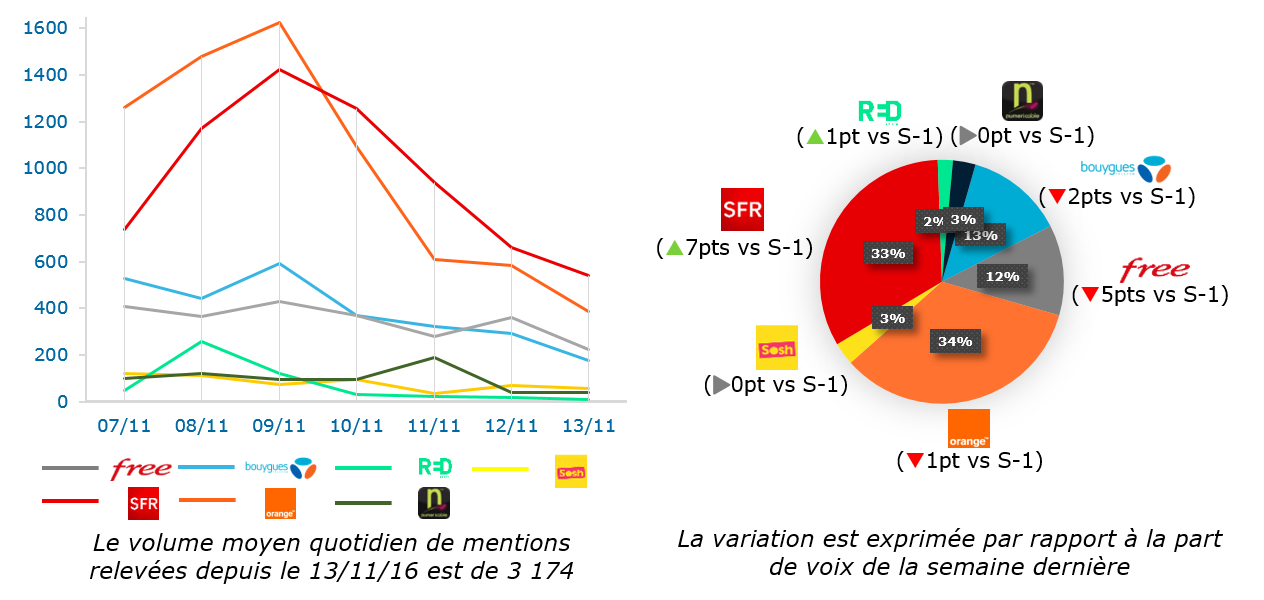 Webhelp vient de publier son " baromètre des télécoms" hebdomadaire pour la semaine du 7 au 11 novembre 2016, qui collecte les données automatiquement sur un corpus de plus de 600 000 000 sites, blogs, forums, profils Facebook et Twitter.