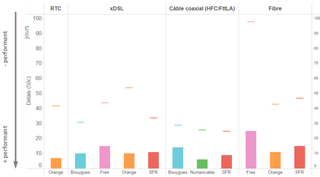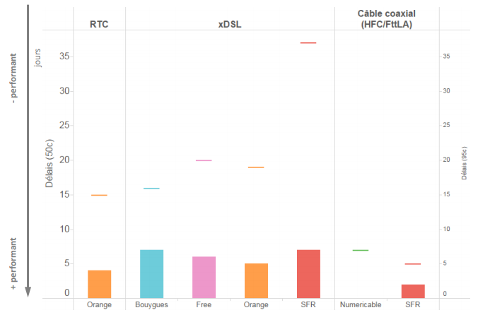 L’histogramme plein représente le 50ème centile des délais de raccordement, c’est-à-dire le délai en deçà duquel sont activés 50% des raccordements les plus rapides. La barre horizontale placée plus haut représente le 95ème centile des délais de raccordement, c’est-à-dire le délai en deçà duquel sont activés 95% des raccordements les plus rapides.