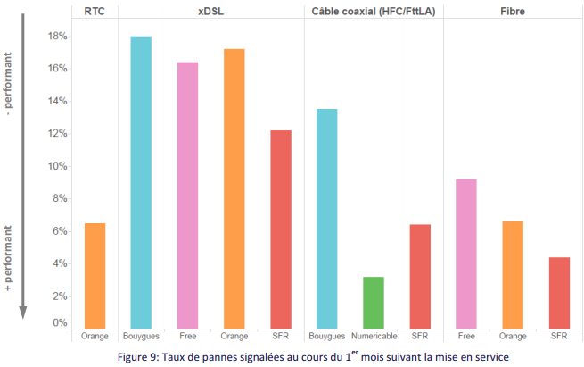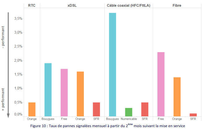 Une panne est définie comme une coupure complète d’un des services principaux fournis sur les réseaux fixes (internet, TV ou téléphonie pour les accès ADSL, fibre coaxiale et fibre optique ; téléphonie pour l’accès RTC). Cet indicateur rend compte des pannes que les abonnés signalent au service client de leur opérateur et qui ne sont pas résolues lors de l’appel. On constate que sur ces 2 critère, Free est dans la moyenne d’Orange et Bouygues Télécom concernant l’ADSL, mais est celui qui affiche le plus gros taux de pannes en FTTH.