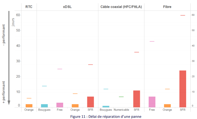 Concernant la réparation d’une panne, Free affiche un délai d’environ 4 jours en ADSL, soit un peu plus que Bouygues et Orange, mais en dessous de SFR qui affiche près de 10 jours. En FTTH, le délai est plus long chez Free, au dessus d’Orange mais en dessous de SFR qui affiche un délai de réparation d’environ 25 jours.