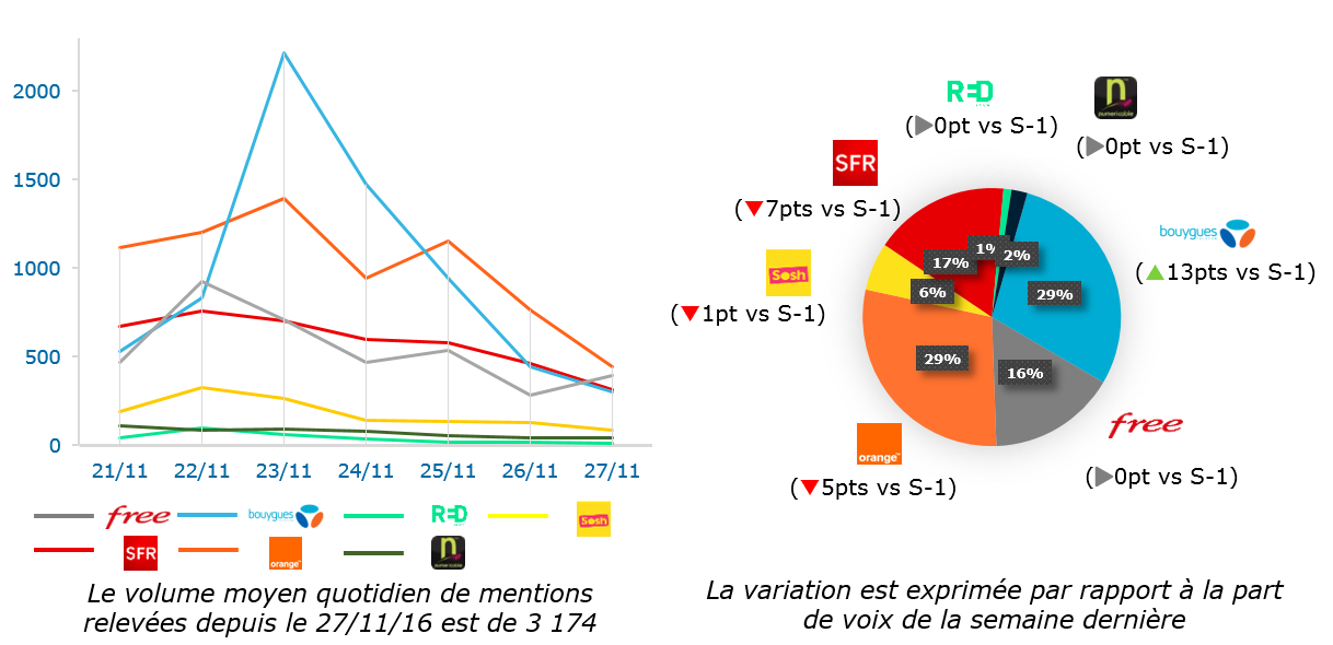 Webhelp vient de publier son " baromètre des télécoms" hebdomadaire pour la semaine du 21 au 27 novembre 2016, qui collecte les données automatiquement sur un corpus de plus de 600 000 000 sites, blogs, forums, profils Facebook et Twitter.