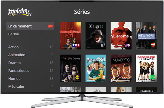 – Molotov (gratuit) : 36 chaînes dont les 25 chaînes de la TNT française et 10 heures de bookmarks.