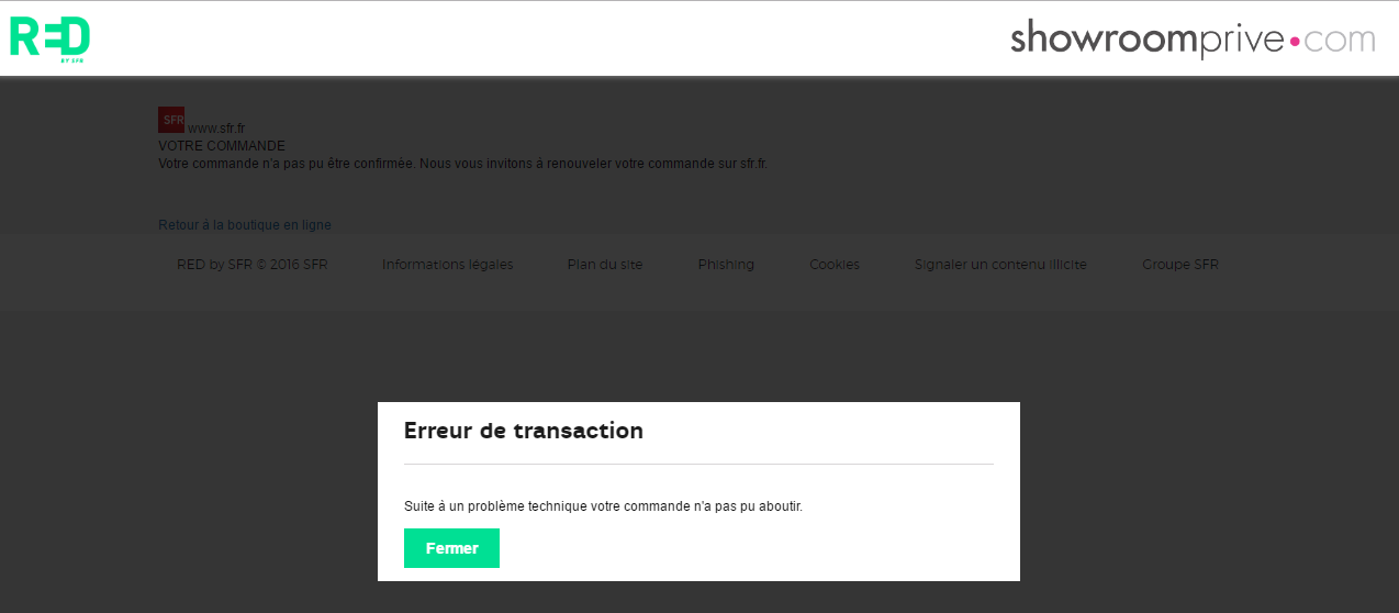 Jérôme, lecteur d’Univers Freebox, qui souhaitait souscrire à cette offre nous rapporte « qu’il est impossible d’y souscrire depuis 2 jours. Impossible d’aboutir à la fin de l’inscription, il semble que ce soit le cas pour tout le monde. Et maintenant Showroom privé et Red se renvoient la balle sans donner aucune réponse ni solution ». Il nous a transmis le message d’erreur qui s’affiche à la fin de l’inscription :