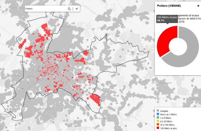 On peut voir sur la secondes cartes, que 34,1% des logements et locaux professionnels peuvent avoir accès à la fibre FFTH. Soit la presque intégralité du réseau très haut débit de Poitiers.
