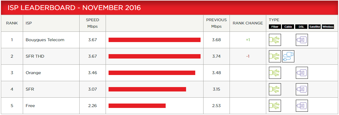 Comme chaque mois, Netflix publie son ISP Speed Index, qui mesure la vitesse moyenne de ses flux selon les pays et les opérateurs. Et durant le mois de novembre tous les opérateurs sont restés à peu près stables, ou en légère baisse. Tous, sauf Free, qui accuse une forte chute pour le troisième mois consécutif et tombe à son plus bas niveau, à 2,26 Mbits/s. Bouygues Télécom prend la première place avec un débit moyen de 3,68 Mbits/s
