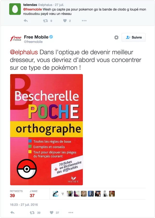 Clin d’oeil – Régulièrement les Community Manager des opérateurs sont soumis à des interpellations de leurs abonnés sur les réseaux sociaux pour le moins musclées. Insultes, vulgarités, tournures familières ou incompréhensibles, les CM des opérateurs doivent rester à tous instants réactifs et pertinents. Il leur arrive parfois de sortir quelques pépites comme le rapporte aujourd’hui « Bescherelle ta mère ». Le CM de Free Mobile donne ainsi quelques conseils pour devenir le meilleur dresseur de Pokémon et maîtriser l’orthographe.