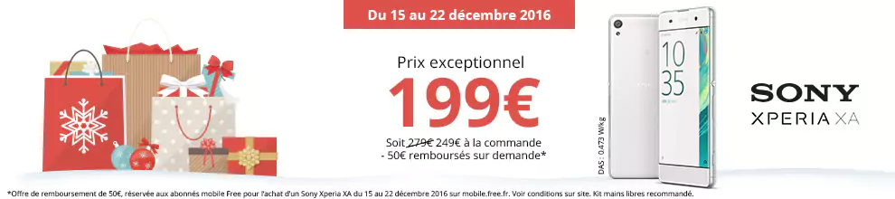 Free Mobile vient d’annoncer sur son site web qu’il lançait une offre spéciale sur l’Xperia XA. Ce dernier est proposé, à partir d’aujourd’hui et jusqu’au 22 décembre, à 199€ au lieu de 279€. Ce tarif promotionnel comprend une baisse de tarif de 30€ ainsi qu’une offre de réduction de 50€, dont les modalités sont disponibles ici.