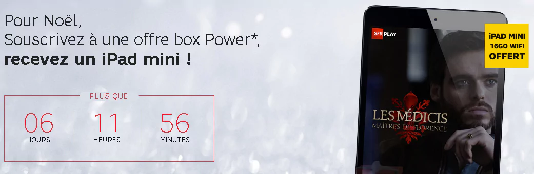 SFR a lancé aujourd’hui une nouvelle offre promo sur ses offres box. Pour tout nouvel abonnement, il offre un iPad mini 16Go d’une valeur de 249€. Un joli cadeau, mais celui-ci est cependant réservé aux forfait les plus chers : POWER à 44,99€/mois (34,99€/mois la 1ère année), POWER+ à 54,99€/mois (44,99€/mois la 1ère année) et PREMIUM à 74,99€/mois (59,99€/mois la 1ère année).
