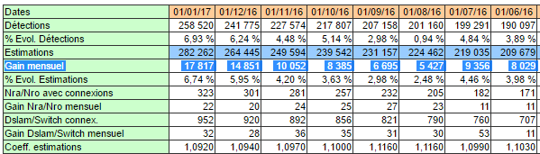 Du coté du déploiement de NRO, le chiffres sont plutôt bons puisque 22 nouveaux NRO ont été activés le mois dernier. A noter que c’est principalement sur les zones moyennement denses qu’ont été déployés ces nouveaux NRO. Au 1er janvier, Free comptait 323 NRO.