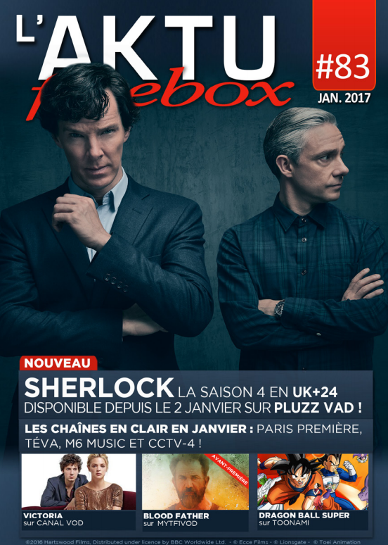 Free vient de publier son magazine AKTU Freebox du mois de janvier. Comme tous les mois, l’AKTU Freebox fait le tour de l’actualité télévisuelle de la Freebox. En couverture de ce numéro 83, la saison 4 de la série Sherlock, qui est disponible en UK+24 sur PLUZZ VAD. Ce magazine fait également le tour des chaînes offertes ce mois-ci sur Freebox TV, dont les chaînes du groupe M6 ou encore la chaîne CCTV4
