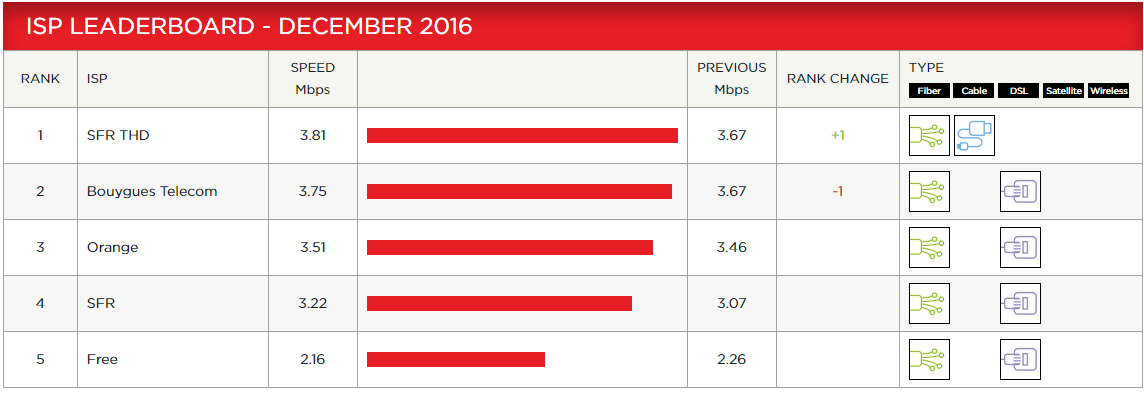 A en croire les chiffres, SFR THD s’empare de la tête du classement et progresse avec un débit moyen de 3,81Mbits/s contre 3,67Mbits/s en novembre dernier. Bouygues rétrograde mais reste à l’affût et passe de 3,67 Mbits/s à 3,75 Mbits/s. Orange complète le podium et poursuit sur sa lancée avec 3,51Mbits/s.