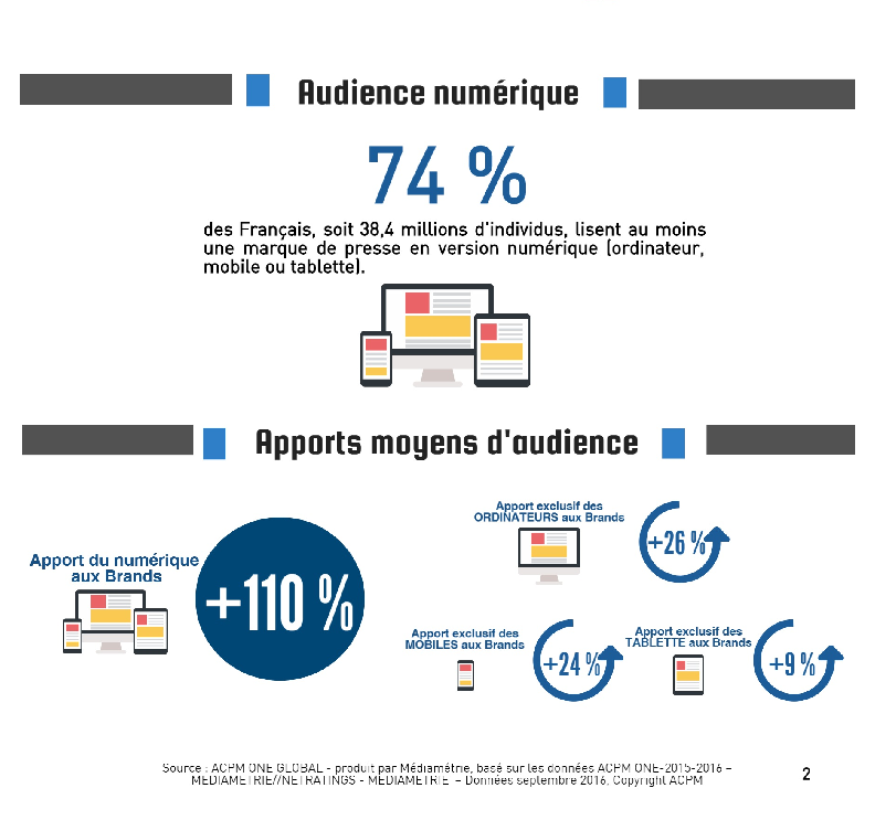 L’ACPM rapporte enfin que le gain moyen d’audience apporté par le numérique est de 110% et que 74,5 % des français soit 38,4 millions d’individus, lisent au moins une marque de presse via leur smartphone. De quoi pousser certains médias à développer ou déployer leurs applications le plus rapidement possible.
