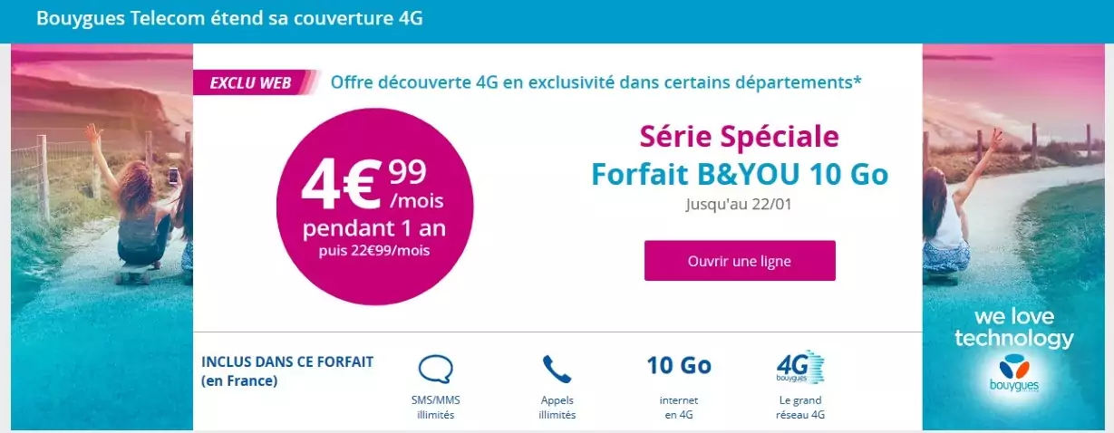 Un forfait B&YOU 10 Go 4G, appels et SMS illimités sans engagement, à 4,99€ au lieu de 22,99€ par mois pendant un an, disponible uniquement dans certains départements.
