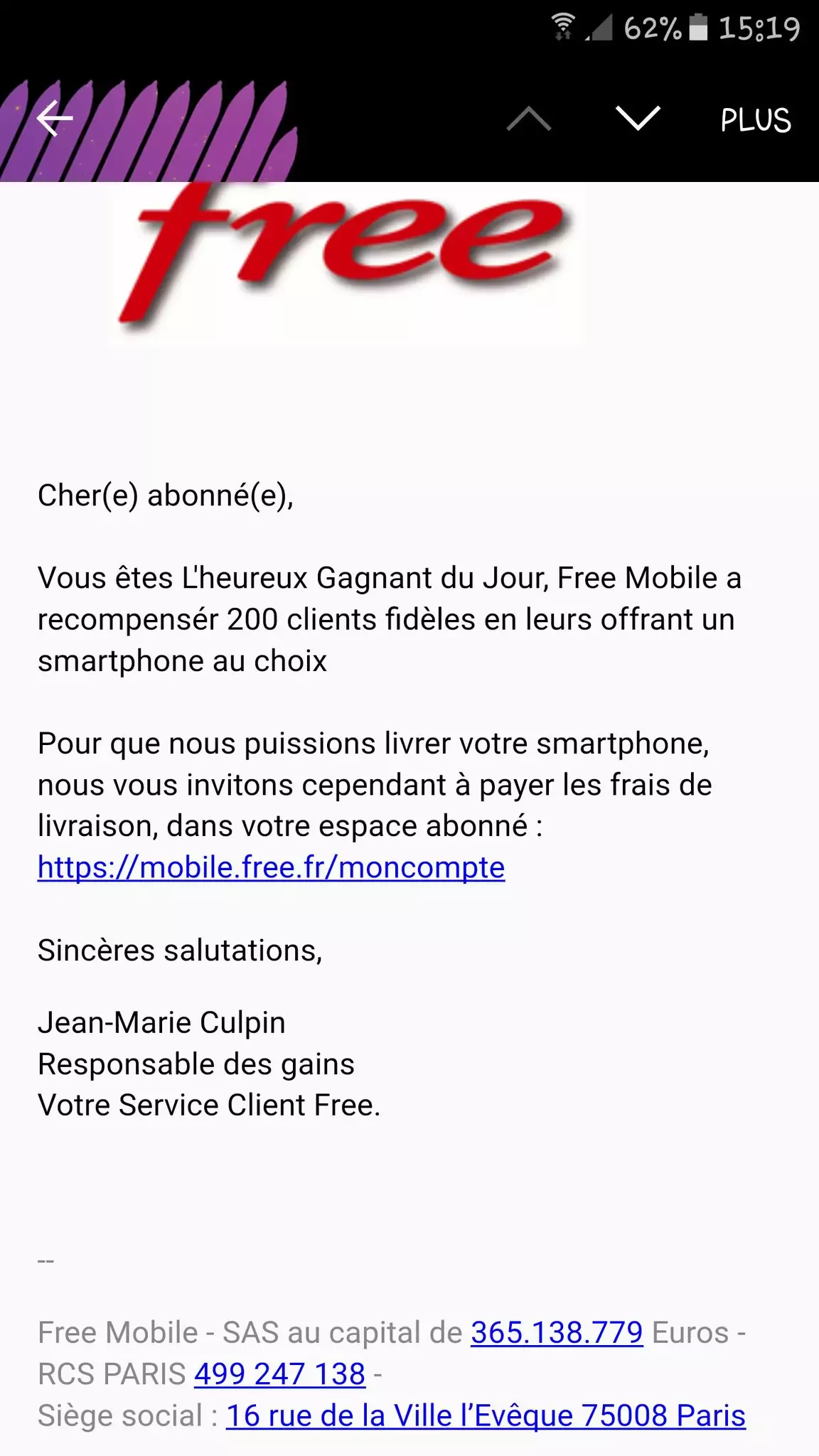 Une nouvelle arnaque visant les abonnés Free est actuellement en cours. Elle prend la forme d’un concours organisé par Free et pour lequel vous auriez gagné le smartphone de votre choix. Il est signé d’un certain Jean-Marie Culpin, qui serait « responsable des gains » de Free, un poste qui n’existe évidemment pas chez l’opérateur.
