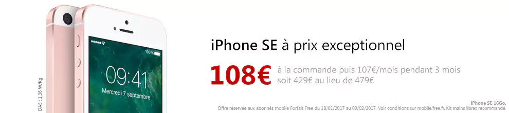 L’iPhone SE-16Go bénéficie d’une baisse de tarif exceptionnelle valable du 19 janvier au 03 février. L’Iphone SE passe de 479€ à 429€ soit 50€ de baisse de tarif. Celle-ci est également appliquée lors du paiement en 4 fois sans frais : 108€ à la commande puis 3×107€