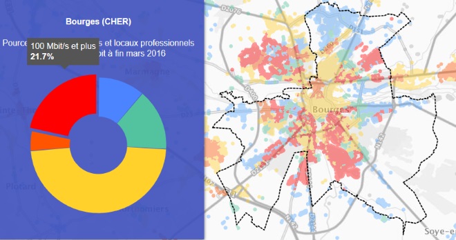 Grâce à la première carte on peut voir que la ville de Bourges est couverte à 21,7% par le très haut débit.