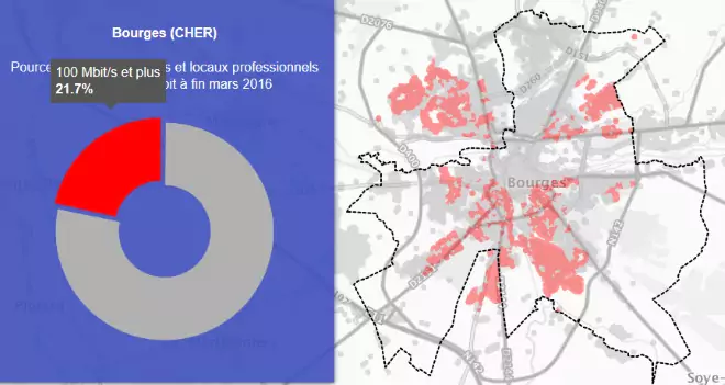 Grâce à la première carte on peut voir que la ville de Bourges est couverte à 21,7% par le très haut débit.
