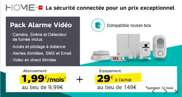 C’est une offre un peu particulière qu’a lancé aujourd’hui SFR sur le site Showroom Privé. Il s’agit de Home by SFR, un pack d’alarme vidéo compatible avec toutes les box. Jusqu’au mardi 31 janvier 8h, l’abonnement à Home by SFR est de 1,99€/mois durant 12 mois puis 9,99€/mois. Par ailleurs, l’achat de l’équipement est proposé à 29 euros au lieu de 149€. Il n’y a pas d’engagement mais des frais de résiliation de 149 € sont applicables en cas de résiliation avant 12 mois
